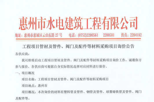 惠州市水電建筑工程有限公司成立于一九六四年四月,隸屬惠州市水務(wù)集團(tuán)有限公司,是一家國(guó)有綜合性施工企業(yè),主營(yíng)水利水電工程、房屋建筑、市政工程等施工業(yè)務(wù)。公司擁有水利水電工程施工總承包一級(jí)、建筑工程施工總承包一級(jí)、市政公用工程施工總承包一級(jí)、公路工程施工總承包三級(jí),公路路基、路面及建筑裝修裝飾專業(yè)承包二級(jí),環(huán)保工程、機(jī)電安裝、河湖整治、輸變電工程專業(yè)承包三級(jí)等經(jīng)營(yíng)資質(zhì)……